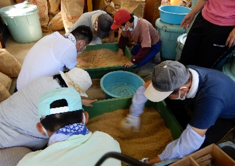 手作業で撹拌(かくはん)し、熟成させたボカシを天日干ししてから計量し袋詰めまで利用者さんが行います。
