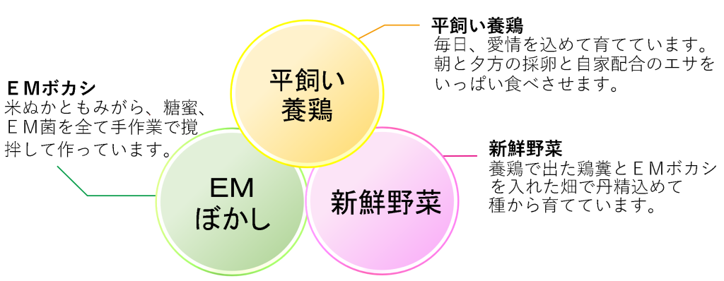 星の村では、以下の「EMボカシ」、「平飼い養鶏」、「新鮮野菜」の豊かな自然の中で行う3つの作業を柱としております。